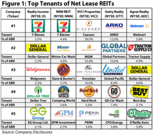 Portfolio composition is crucial because it drives the likelihood and magnitude of credit losses, the risk of occupancy fallout, and ultimately valuation. While net lease REITs have become increasingly diversified, retail remains the anchor, contributing ~75% of annualized base rent (ABR) on average, with gaming, industrial, and other property types making up the balance. Within retail, exposure is often concentrated in grocery, quick service restaurants (QSRs), casual dining, convenience stores, and a growing auto services and car wash segment as shown by the top five tenants of a few net lease REITs in Figure 1.