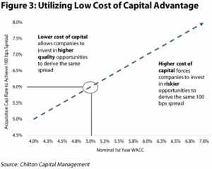 When these pieces are in place, REIT equity behaves like low-cost currency, igniting the “flywheel effect”. Visible AFFO per share growth from the widened investment spread helps sustain, or even expand, the premium to NAV, keeping the blended cost of capital low and enabling the next leg of accretive external growth. Management can buy higher quality real estate for similar spreads to peers or achieve even wider spreads at the same quality level, as illustrated in Figure 3.
