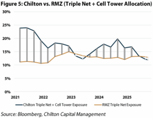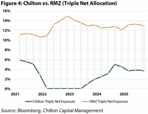 Our investment framework rewards organic cash flow growth and low NAV premiums, conditions that are not always present in net lease. Over the past several years our Chilton REIT strategy has maintained an underweight allocation to the sector as shown in Figure 4. Aside from 2022, when the defensive nature of the group led to outperformance during a rapid rise in interest rates, the underweight proved correct as the sector subsequently lagged the MSCI U.S. REIT Index (Bloomberg: RMZ) by 1,400 bps and 900 bps in 2023 and 2024, respectively.