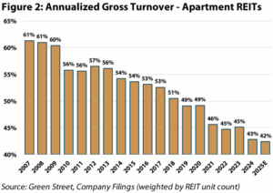 On internal initiatives, management teams emphasized centralized staffing models to drive efficiencies, value-add resident services to generate incremental income, and accelerating use of AI to automate key tasks. As for renter demand, the elevated cost to own has pushed apartment turnover near all-time lows (Figure 2), keeping occupancy high (~96%) and leading way to concessions, or apartments offering one to two months of free rent, finally tapering off.