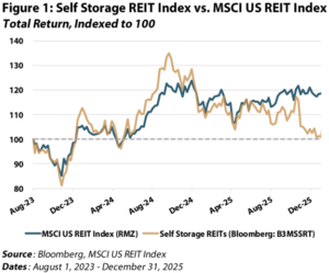Since the last Chilton REIT Outlook covering the self-storage sector was released in August 2023, “Self-Storage REITs: A Cautious Outlook for a COVID Winner”, the sector has faced several headwinds. Over the 29 months ending December 31, 2025, self-storage REITs generated a total return of +1%, trailing the MSCI U.S. REIT Index (Bloomberg: RMZ) by roughly 1600 basis points, as shown in Figure 1. However, performance has improved quickly to start 2026, with self-storage now outperforming nearly every REIT sector year-to-date, up +17% vs. +11% for the RMZ.
