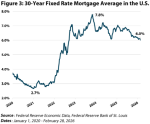 The key debate for 2026 continues to revolve around dislocation, as housing turnover remains the cleanest proxy for incremental move-in activity. Since 2023, existing home sales in the U.S. have been near historic lows (Figure 2) largely due to the “lock-in effect”. With ~80% of existing mortgages carrying rates below 6%, homeowners have been reluctant to give up low-rate financing. Mortgage rates have come down from their 25-year high of 7.8% in October 2023 (Figure 3), but rates likely need to move lower from here before mobility returns in a material way.