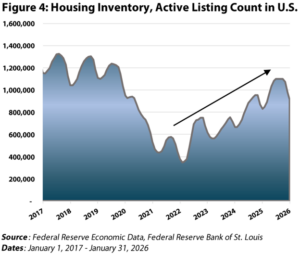 In spite of the optimism apparent in self-storage’s year-to-date performance, the housing data has not started to make a positive turn. In fact, existing home sales in January 2026 declined 8.4% month-over-month, the largest drop in nearly four years. On the positive side, for-sale housing inventory has improved modestly off the lows (Figure 4), which can be a leading indicator for home sales. We are closely watching these metrics and need to see other data confirm that mobility has increased before getting too excited about the sector.