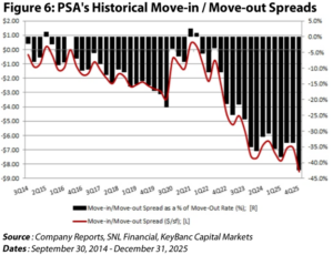 From an operating standpoint, self-storage REITs need a recovery in move-in rates (street rates) before seeing a return to historical average same-store NOI growth. Right now, the gap between move-in and move-out rents is still remarkably wide and negative. As shown in Figure 6, PSA’s move-in vs. move-out spread is sitting at its weakest level on record, with the rent roll-down widening to -42% in 4Q25 (move-ins of $11.60/sf vs. move-outs of $20.12/sf) compared with -34% in 3Q25. In the meantime, ECRIs can somewhat support in-place performance due to the “stickiness” of tenants, but higher move-in rents are critical for supporting growth in cash flow.