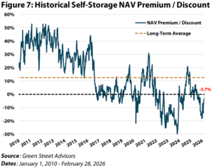 Self-storage REITs started 2026 trading at an 18% discount to net asset value (NAV), the lowest point in nearly two years. After the sector’s early-year rally, that has tightened to about a 4% discount, as shown in Figure 7. While a meaningful re-rating, it still sits well below the sector’s long-term average premium of ~12% and modestly below the more recent 10-year average premium of ~2%. We do not assume the sector will revert back to the peak premiums of the 2010s, but a structural case for a premium valuation still exists given the sector’s low capital expenditure burden, resilient cash flow profile, low obsolescence risk, and operating leverage that comes with scale, data, and lower overhead.