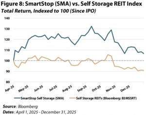 SmartStop has given us a differentiated way to play the next leg of the cycle. Since initiating our overweight position after participating in its IPO on April 1, 2025, SMA outperformed peers by ~1,500 bps (Figure 8) to close out 2025. Despite the large-cap group having already re-rated considerably, SMA still sits at a high-teens discount to NAV and trades at an AFFO multiple about two turns below peers. With a roughly ~$2 billion equity market cap vs. EXR and PSA closer to $30 billion and $50 billion, respectively, external growth can significantly move the needle here.