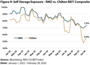 After roughly two and a half years of uncertainty and relative underperformance, self-storage feels closer to an inflection point, even if the data has not fully caught up yet. Supply is no longer expanding at an overwhelming rate, market breadth is improving, and the sector is increasingly benefiting from platforms and technology that can help monetize the next leg of fundamentals when demand firms. Still, housing turnover remains the major swing factor, and until we see clearer evidence that move-in rents are rising and discounting is fading, we believe a modest underweight remains appropriate (Figure 9) despite the sector’s strong start to 2026. Importantly, that discipline has served us well through the past few years, while our astute analysis of SMA provided strong relative performance amidst tough industry conditions in 2025.